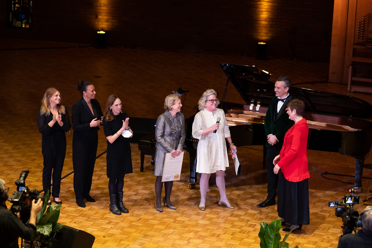 Feb. 9, 2022: Concordia Conservatory’s annual gala benefit concert on Saturday night, February 5 celebrated Executive Director Kathleen Suss for her 25 years of leadership. “SILVER” was held as a broadcast live concert with a studio audience from Sommer Center for the Performing Arts. Mayors Mary Marvin of Bronxville, and Omayra Andino of Tuckahoe, Trustee Cara Kronen of Tuckahoe, Assemblywoman Amy Paulin, and Senator Shelley Mayer were in attendance and presented their congratulations to Suss during the live broadcast concert and Eastchester Town Supervisor Anthony Colovita sent a proclamation for the event.