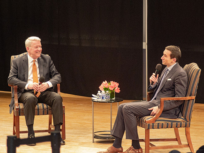 March 4, 2026: Author of the bestseller 1929, award-winning journalist for The New York Times and a co-anchor of CNBC’s Squawk Box, Andrew Ross Sorkin spoke to a capacity crowd at the annual Brendan Gill Lecture at Sarah Lawrence College on Thursday, February 26. Together with master interviewer David Westin, the anchor of Bloomberg Wall Street Week, Sorkin discussed the lead up to and aftermath of the crash of 1929, the focus of Sorkin’s newest book. The evening’s conversation was a gift to the community from the Bronxville Historical Conservancy (BHC) and was presented free to all guests.
