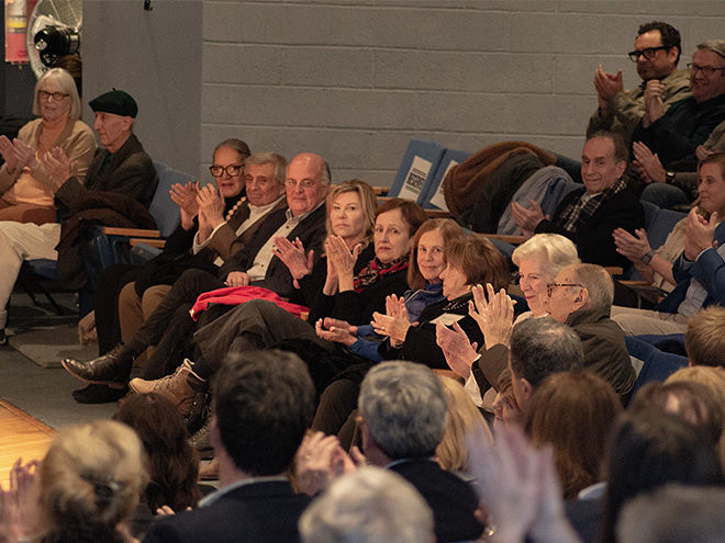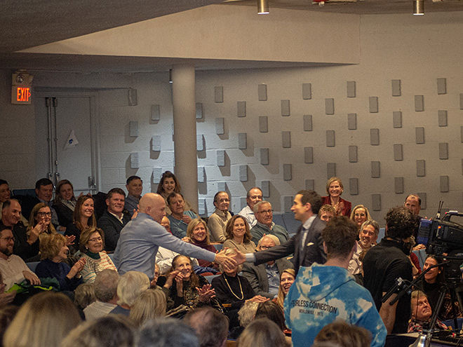 BHC Co-Chair Suzanne Pratt Davis welcomed the audience and noted that this was the 28th presentation of the popular annual event that was named after former Bronxville resident, author and preservationist, Brendan Gill. Davis turned the podium over to Marilynn Hill, co-founder of the BHC, who introduced the speaker, noting Sorkin’s many accomplishments. One highlight was her revelation that Sorkin’s fifth-grade teacher from Scarsdale, Peter Haupt, was in the audience – a surprise that prompted Sorkin to exclaim that “You made such an impression on my whole life,” and “I reference you all the time.” Hill also mentioned Sorkin’s many achievements, from launching the New York Times’ DealBook when he was 24, to becoming the co-creator and executive producer of the Showtime drama, Billions.