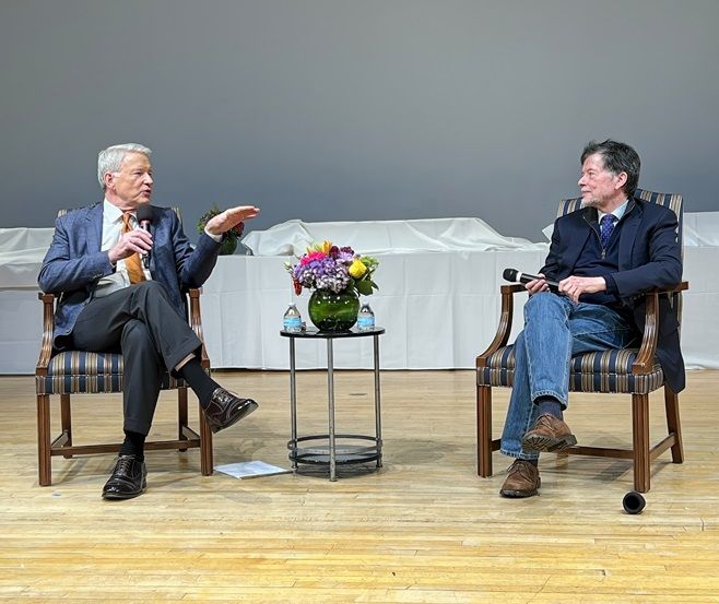 Feb. 22, 2024: On Friday, February 9, the Bronxville Historical Conservancy presented a conversation between Ken Burns, renowned filmmaker and documentarian of American life and history, and David Westin, anchor of Bloomberg Wall Street Week, and a local resident. A capacity crowd attended the event held in Sarah Lawrence’s Reisinger Concert Hall. Bronxville Historical Conservancy co-chair, Erin Saluti, welcomed the audience and introduced Marilynn Hill, chair of BHC’s Brendan Gill Lecture series.