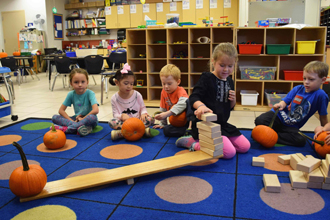 The lessons started off by building the students' language skills as they described and drew their pumpkins, focusing on their shape, color, size, and texture. As part of a science lesson, the kindergartners tested to see if the pumpkins would float or sink in water. They also employed a variety of math skills to examine their pumpkins, including sorting them; measuring their weight, height, and circumference; and counting their seeds.
