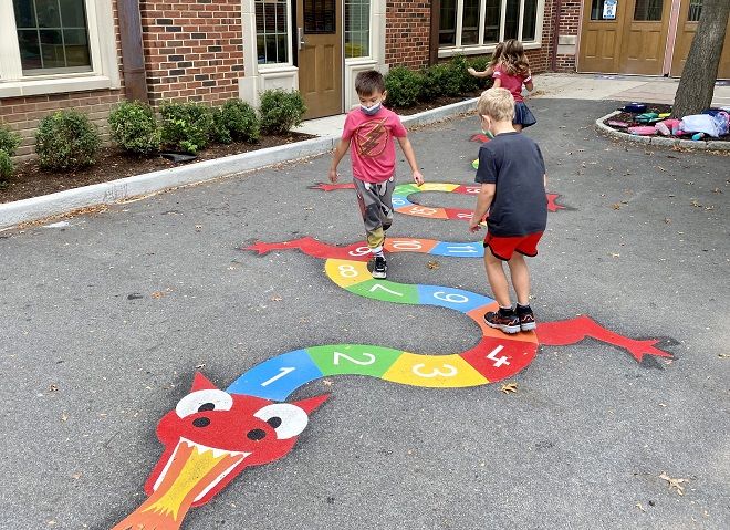 Photos: Bronxville Elementary School students play games on the thermoplastic playground surface, which was newly installed on the blacktop part of the playground.