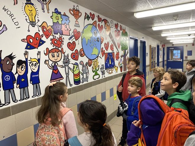 Nov. 6, 2024: From hearts and a lighthouse to a book, paintbrush and trees, a new wall mural at Bronxville Elementary School serves as a dynamic reflection of student creativity. The colorful work of art, designed and painted by artist Bren Bataclan, was brought to life in one week while capturing the spirit of the Bronxville Promise.