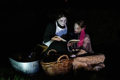 Graduate theater students from Sarah Lawrence College played the five primary “speaking” ghosts, with Megan Hamm in the role of artist Mary Fairchild MacMonnies Low; Zee Hanna in the part of architect William Augustus Bates; Maegan Murphy as William Van Duzer Lawrence; Red Guhde as Edmund Clarence Stedman; and Laurie King as Harriet Hubbard Ayer (cosmetics tycoon). In addition, high school students were cast as wandering ghosts. This year’s GOB added the true story of the “Leatherman,” a nameless leather-clad man who roamed throughout Westchester County in the 19th century.