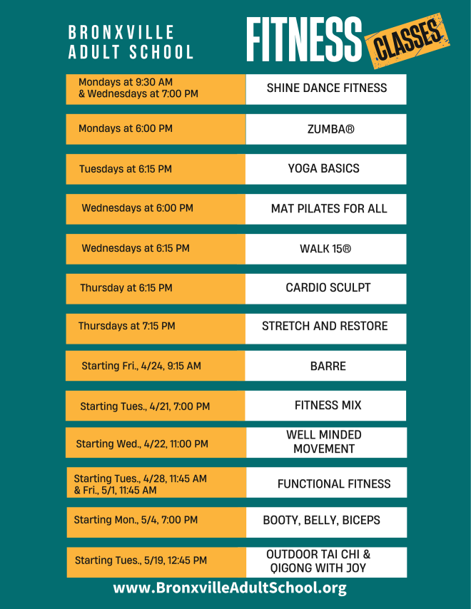 Spring 2026: The Bronxville Adult School Offers Fitness Classes. See more information below.  Click here to sign up.