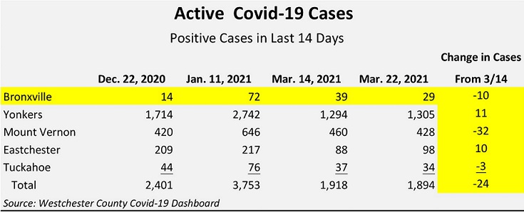 Mar. 24, 2021: Covid-19 cases in Bronxville fell this week from 39 on March 14 to 29 on March 22, 2021. Overall, cases in Bronxville and nearby towns fell by 24. Mount Vernon saw the largest decline (32 cases) followed by Bronxville and Tuckahoe. Cases in Yonkers and Eastchester were up this week. The Westchester positivity rate on March 22, 2021 was 5.3%, You can view the Westchester Covid-19 interactive map here.