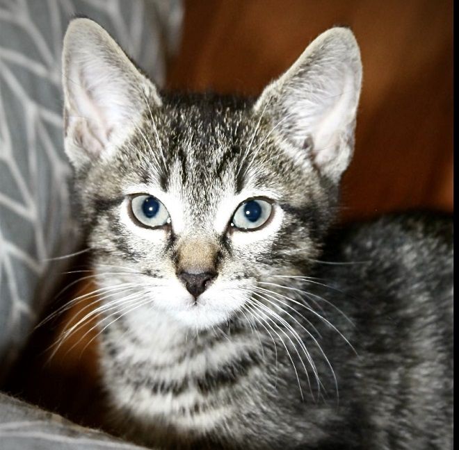 June 23, 2021: Keaton is an 11-week-old, gray, blue and silver tabby who is one of a litter of five. He is always the first among his siblings to say hello with his melodic purrs and will unabashedly give head bumps to encourage you to pet him.