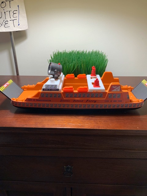Eric and Caroline pondered this and came up with a great idea. They looked at their Staten Island Ferry toy (see photo below) and realized that the ramp was the perfect size to cross Pe-Pa’s Bridge.