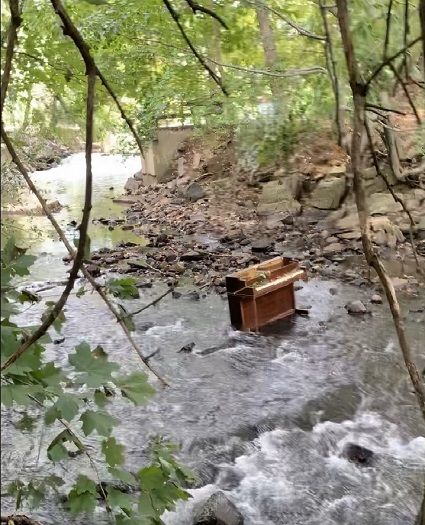 Pictured: Piano in the Bronx River. In the background of this photo, you can see the remains of Pe Pa's bridge, which was washed away by Hurricane Ida.