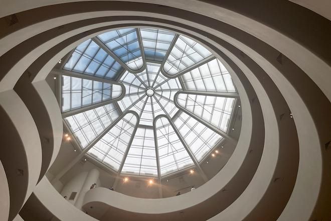 Glass dome of The Guggenheim Museum, 92 feet above the ground level. It is sometimes suggested that Frank Lloyd Wright may have been influenced by a spider web when designing the center light well. Photo by A. Warner