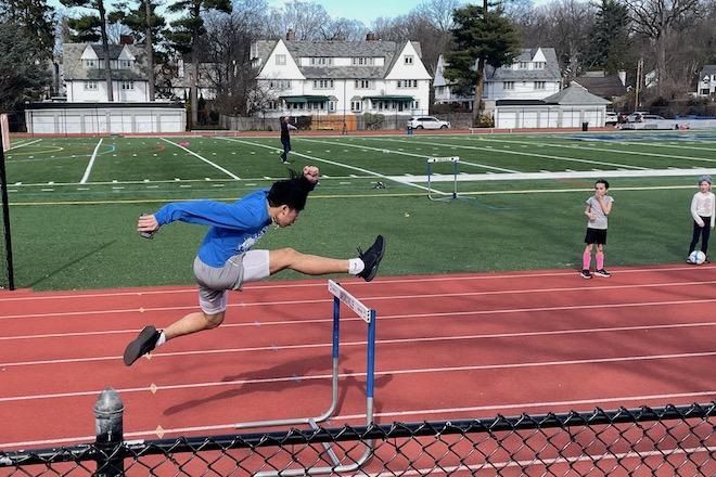 Pictured: Christan Camara of Bronxville, a member of the Fordham Prep shuttle hurdle relay team. The relay team placed # 1 in the Nike Indoor Nationals track and field championships, clocking at 30.93 seconds.  Photo by A. Warner