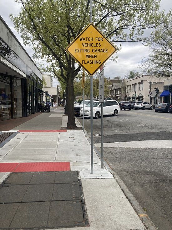It reads: "Watch for Vehicles Exiting Garage When Flashing" and is placed near the new driveway to 100 Pondfield Road in Bronxville.