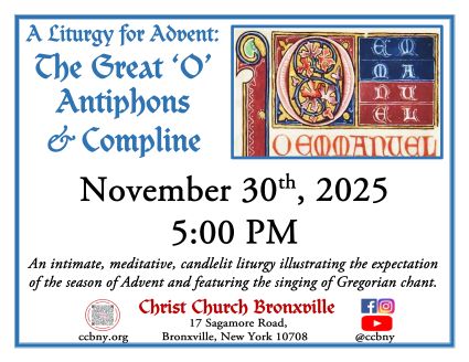 Nov. 30, 2025, 5:00PM:  A Liturgy for Advent "The Great 'O' Antiphons & Compline" at Christ Church Bronxville, 17 Sagamore Road.