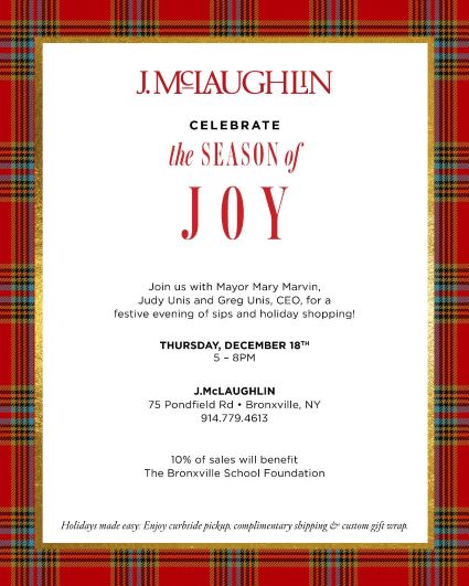 December 18, 5:00 - 8:00PM: Festive Shopping Evening at J. McLaughlin in Bronxville. 10% of sales will benefit the Bronxville School Foundation.