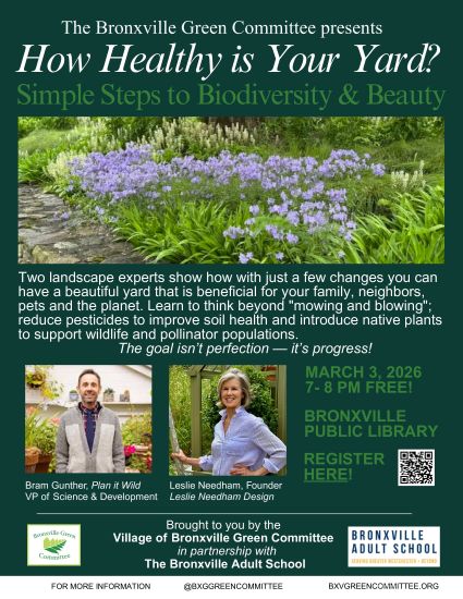 March 3, 2026, 7:00PM: Bronxville Public Library, Free Event: "How Healthy is Your Yard? Simple Steps to Biodiversity & Beauty" Two landscape experts show how with just a few changes you can have a beautiful yard that is beneficial for your family, neighbors, pets and the planet. Featuring Bram Gunther of Plan It Wild and Leslie Needham of Leslie Needham Design. Hosted by the Bronxville Green Committee in partnership with the Bronxville Adult School. Register HERE!