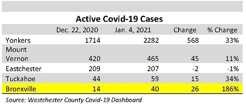 Since December 22, 2020, active Covid-19 cases, defined as "positive cases within the last 14 days," have increased in Bronxville and nearby. For example, active cases in Bronxville have nearly tripled from 14 on December 22, 2020 to 40 on January 4, 2021. Yonkers and Mount Vernon have the largest number of active Covid-19 cases in our area, followed by Eastchester. Click here to go to the Westchester County Covid-19 interactive map for more information.