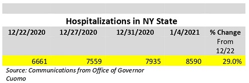 Hospitalizations in New York State for Covid-19 have also been on the rise since the beginning of the holidays. As shown below, total active cases in the State are up 29% from December 22, 2020 to January 4, 2021. The percent positive in the Mid-Hudson region, which includes Bronxville, has also risen from 6.8% on December 22, 2020 to 8.2% on January 4, 2021.