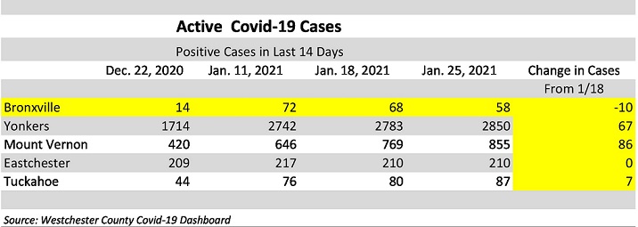 According to the Westchester County Covid-19 Dashboard, as of January 25, 2021, there were 58 cases in Bronxville. While this is lower than last week, it is still well above the pre-Holiday level. Cases rose in Yonkers, Mount Vernon and Tuckahoe this week. Cases are flat in Eastchester and near the pre-Holiday level.