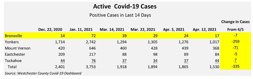 Apr. 14, 2021: The local Covid-19 numbers seem to be moving in the right direction. As of April 12, 2021, there were 17 cases in Bronxville. Cases in Bronxville have been on a gradual decline since the high point of 72 cases on January 11, 2021.