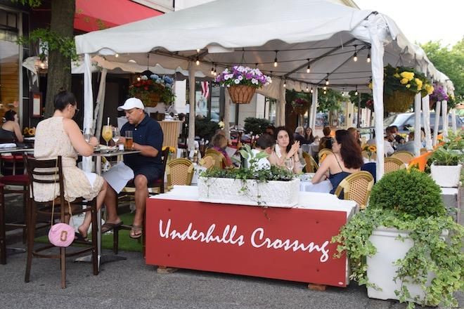 At 74.5 Pondfield Road, three parking spots have been transformed into a terrace to expand the outdoor seating for Underhills Crossing. Beyond mere tables and chairs, the space is carpeted with faux grass, canopied with tents and light strands, and adorned with vases of flowers. Fans are coming next.