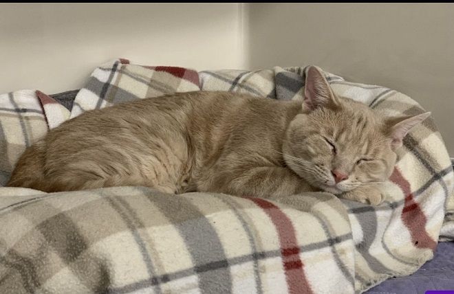 Knicki is a medium size, adult buff, and tan domestic short hair. He is calm and quiet and has the best kitty manners you can imagine. Knicki will lightly tap your arm to signal that he would like to be pet. Actually, he is telling you he wants more petting, as in "please don't ever stop."