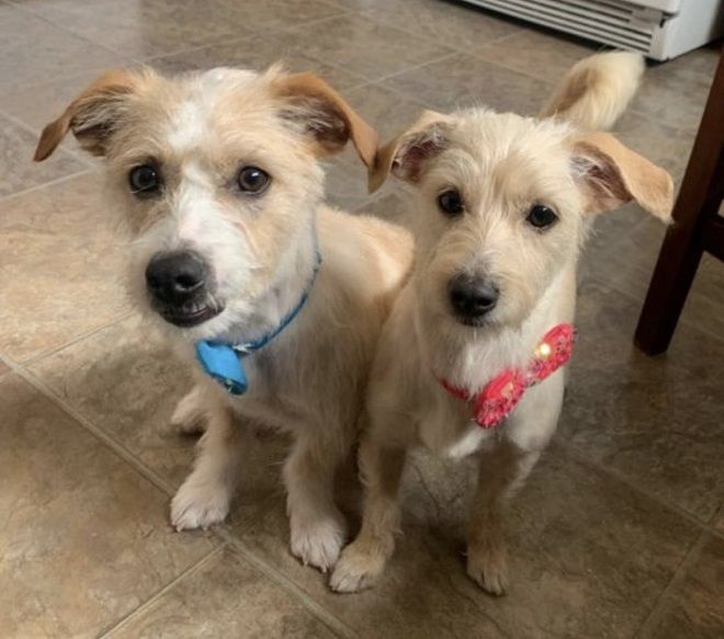 Penelope (red collar) is a 2-year-old, 13-pound Schnauzer mix who is super lovable, curious, and makes friends with everyone.  Sebastian (blue collar) is a 10-month-old, 17-pound schnauzer mix who loves to be around his owners and enjoys being carried and snuggling on your lap.