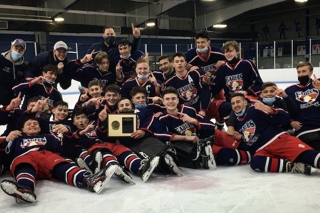 After the goal by Dillon, the Eagles went on to take a 2-1 lead with a goal from junior Will Stupart, and then scored again when Luke Arrighi scored on a loose puck right after Pat Dodson had taken a shot for the Eagles.  A final goal by Dillon with an assist from his co-captain, Earl Gretzinger, led the Eagles to a 4-1 victory celebration. Eastchester’s JP Rosabella, a senior goalie, had 20 saves in the game.
