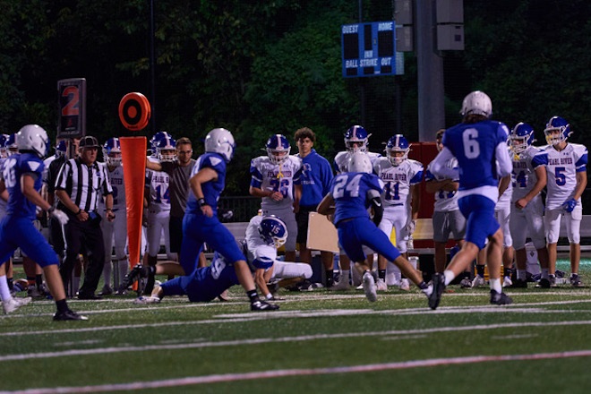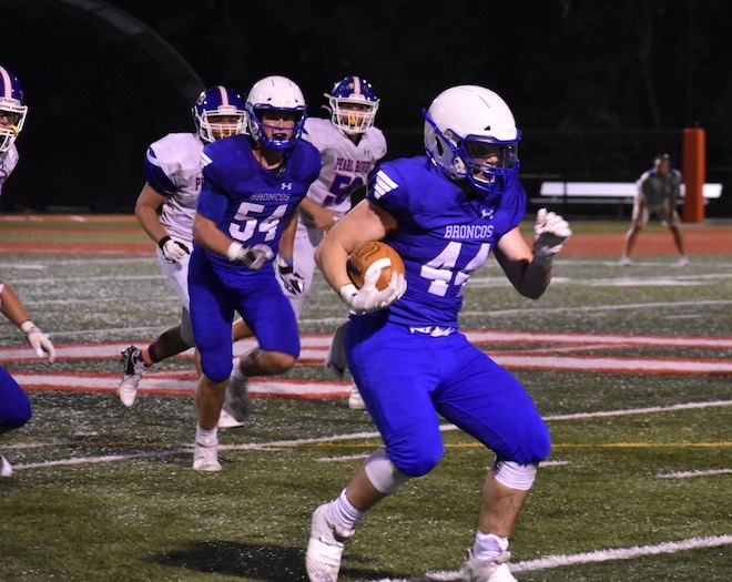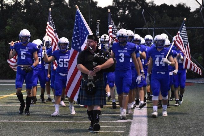Sept. 15, 2021: The Bronxville varsity football team picked up a 48-46 win on Saturday night in a tough battle against Pearl River. It was the first game of the season, and to commemorate 9/11, the Bronco players waved flags as they were led onto Haindl Field by a bagpiper. The game was held at the Eastchester field because Chambers Field suffered damage during Hurricane Ida.