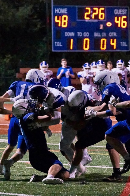 The goal line stop on 2-point conversion: Spencer McCormick #55 and Chris Kelty #3. Photo by David Fenner