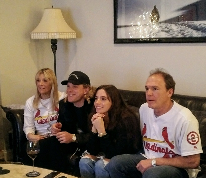 Harrison Bader (second from left) watching the ESPN telecast about the Gold Glove with his mom Janice (far left), sister Sasha (second from right) and Dad Louis (far right)