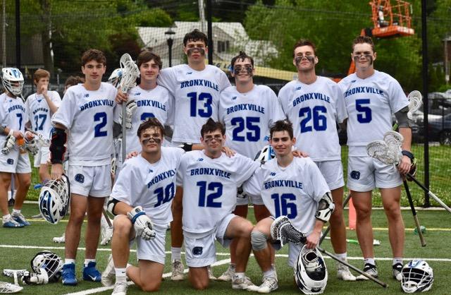 Bronxville lacrosse seniors: Teddy Dolan (2), Finn Ruhanen (3), Chris Kelty (13), Tommy Garofalo (25), Preston Maze (26), Conor O’Neil (5), Spencer McCormick (10), Luke Sheehan (12), Will Stupart (16). Photo by Susan Miller McCormick.