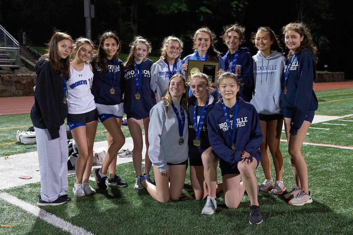 June 1, 2022: At the Sectional Championships held last Thursday at Valhalla High School, the Bronxville girls’ outdoor track and field team scored 136 points to win the Class C title. Putnam Valley placed second with 60 points, and Irvington placed third with 48.25. The Broncos swept the relays at Sectionals and finished in the top three in 11 of the 14 events. Ava Black placed first in the 1500m run, and Milly Koenig had a first-place finish in the triple jump.