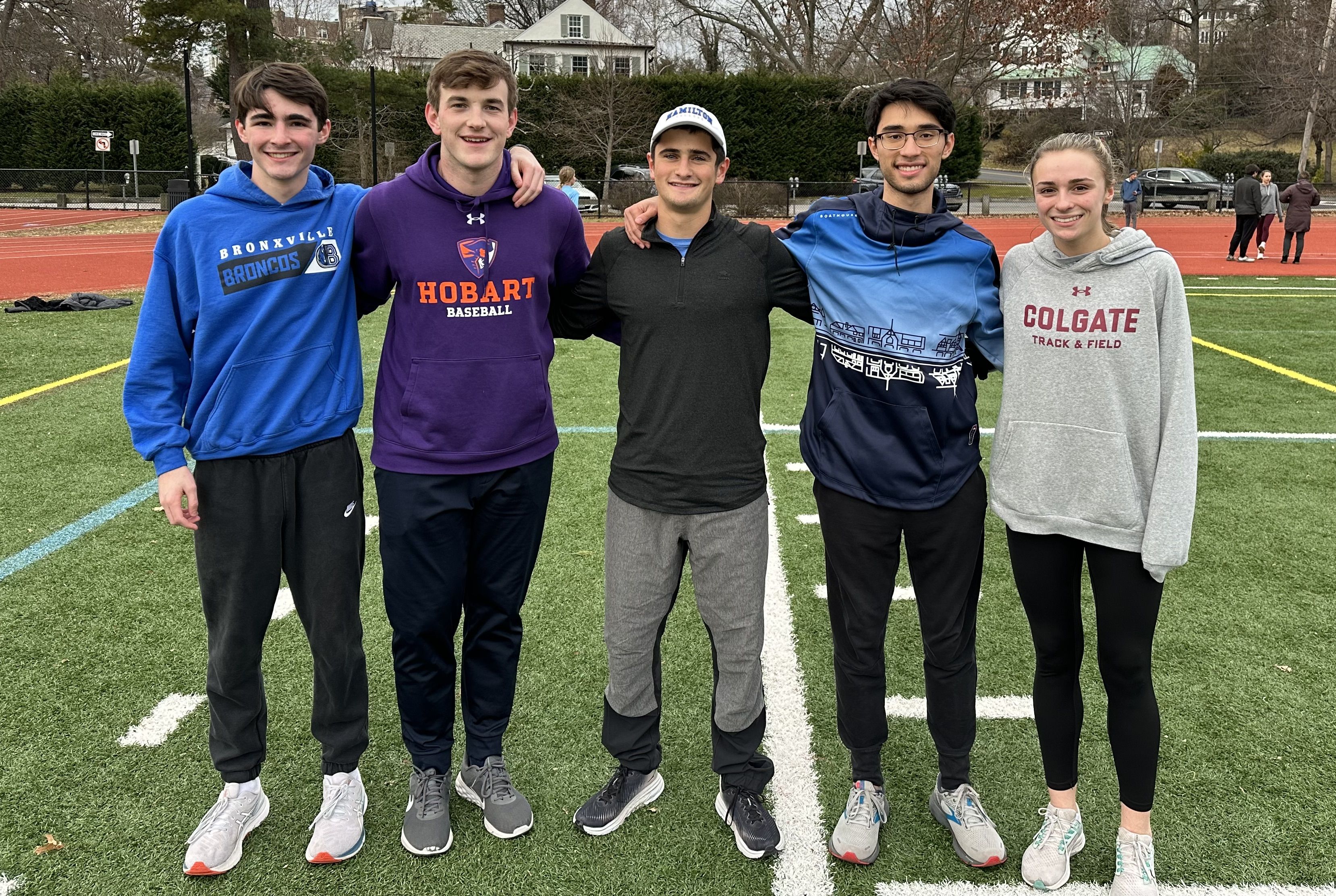 Indoor track and field team captains (l to r): J. W. Henningson, Chris Lockwood, Ellis Goodson, Ian Gegenwarth, and Hope Hershberg. Not pictured: Katie O’Hare and Danielle Dragoni. Photo by J. Murrer.