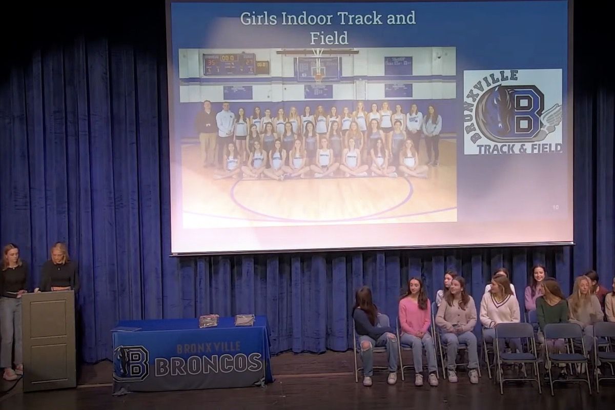 The girls’ indoor track and field team at the Sports Awards Evening. Photo courtesy of Bronxville’s YouTube Channel.