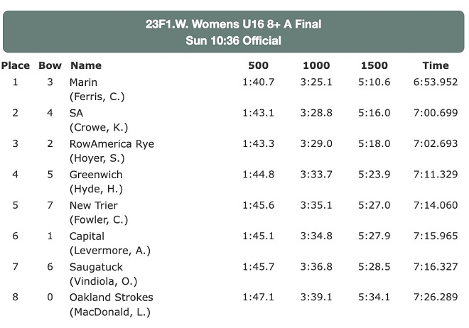 Marin Rowing Association from Grreenbrae, California took first place in a time of 6:53.952, while St. Andrews finished second in 7:00.699. The RowAmerica Rye boat was close behind with a time of 7:02.693.
