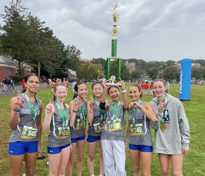 “What an awesome weekend for Bronco cross country,” said the boys’ coach, Jim Agnello. “Despite the rain and poor conditions, the Broncos had a great day. We demonstrated our commitment to excellence and the human side of our sport by sharing our tent in the rain with New Rochelle and a team from Long Beach California.”