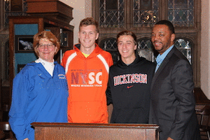 Jan. 6, 2016: Bronxville seniors Joe Pepe and Sam Aherne gathered in the high school library with their parents and school administrators to recognize their commitment to play collegiate sports. This coming fall, Pepe will head to Dickinson College to play baseball, and Aherne will play soccer at Colgate University.