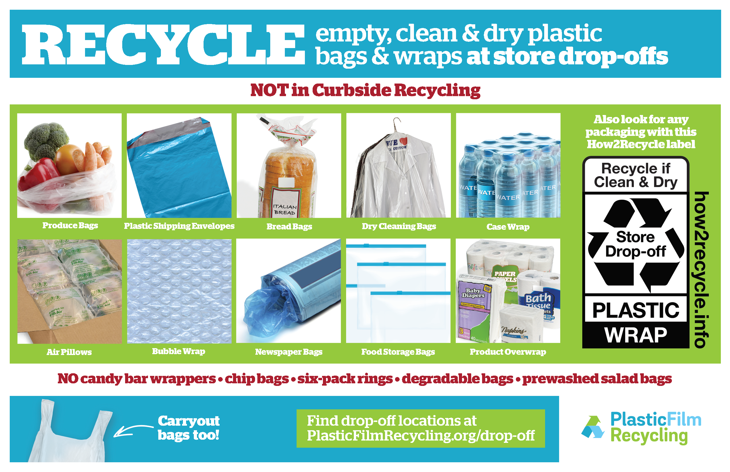 Although recyclable, these plastics should NOT be placed in curbside pickup. The wraps and bags have to be clean and dry to be recycled and collecting them in curbside bins with bottles and containers generally leaves them too dirty and wet to be recycled. Additionally, they can complicate the sorting process at recycling facilities that are not designed to recycle them.