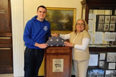 Life Scout Edward Phillips and Mayor Mary Marvin in front of new US Flag disposal box at village hall